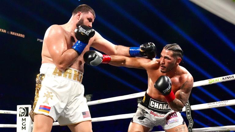 In round five, Hovhannisyan broke through and landed 42 power punches against a fading Navarro. In the final minute of the round, Hovhannisyan unleashed a flurry of punches against Navarro, who was unable to throw any return fire, which eventually forced referee Robert Hoyle to halt the action 2:45 into the round.